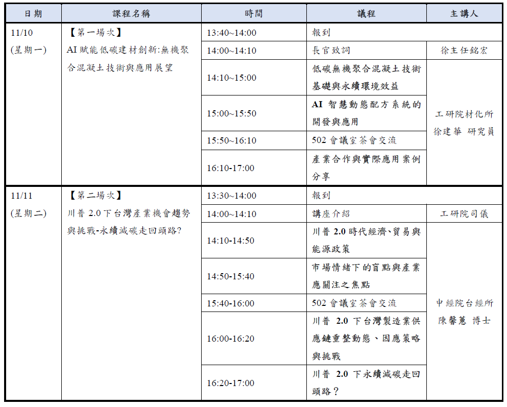 為增進礦業碳管理知能及礦業永續利用,本中心委託工研院規劃2場教育訓練講座,議程詳如附件,歡迎各界踴躍參加。