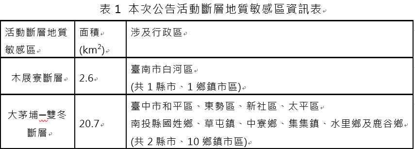 活動斷層地質敏感區(F0016木屐寮斷層)範圍位於臺南市境內,通過臺南市白河區,總面積約2.6平方公里;活動斷層地質敏感區(F0028大茅埔─雙冬斷層)範圍位於臺中市及南投縣境內,通過臺中市和平區、東勢區、新社區、太平區,南投縣國姓鄉、草屯鎮、中寮鄉、集集鎮、水里鄉以及鹿谷鄉等10處行政區,總面積約20.7平方公里。